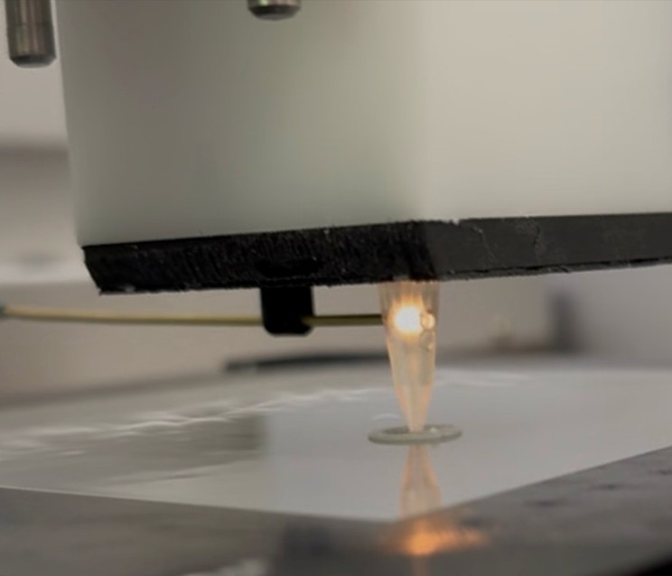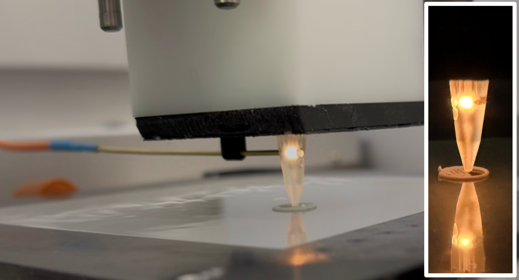 To enable in‑line process monitoring during semi‑solid extrusion (SSE) 3D printing, our Sentronic experts designed a highly compact optical setup that allows a 1.6 mm NIR probe to be positioned directly in the material flow of a standard extrusion nozzle. This required a custom fiber‑optic concept tailored to the extremely limited space available. The resulting configuration features a central collection fiber surrounded by nine illumination fibers, ensuring maximum signal capture despite the tight geometric constraints. Without this dedicated design, PAT integration into such a small nozzle would not have been feasible.